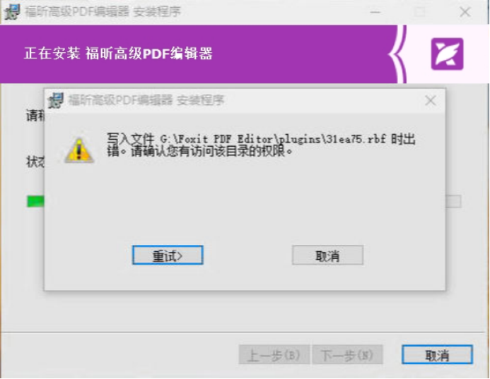 安装提示:写入文件“x盘Foxit PDF Editorpluginsxxx”时出错。请确认您有访问该目录的权限