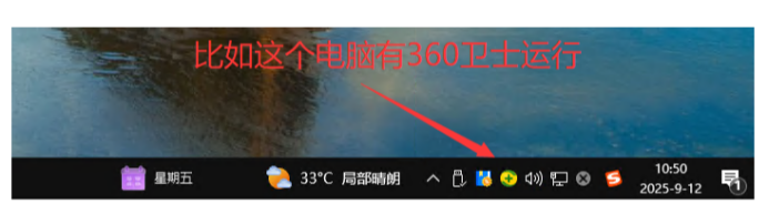 2、查看电脑上是否有安全软件,比如360卫士、火绒等,在电脑任务栏右下角可以看到相关的运行程序,有的话,请先退出来