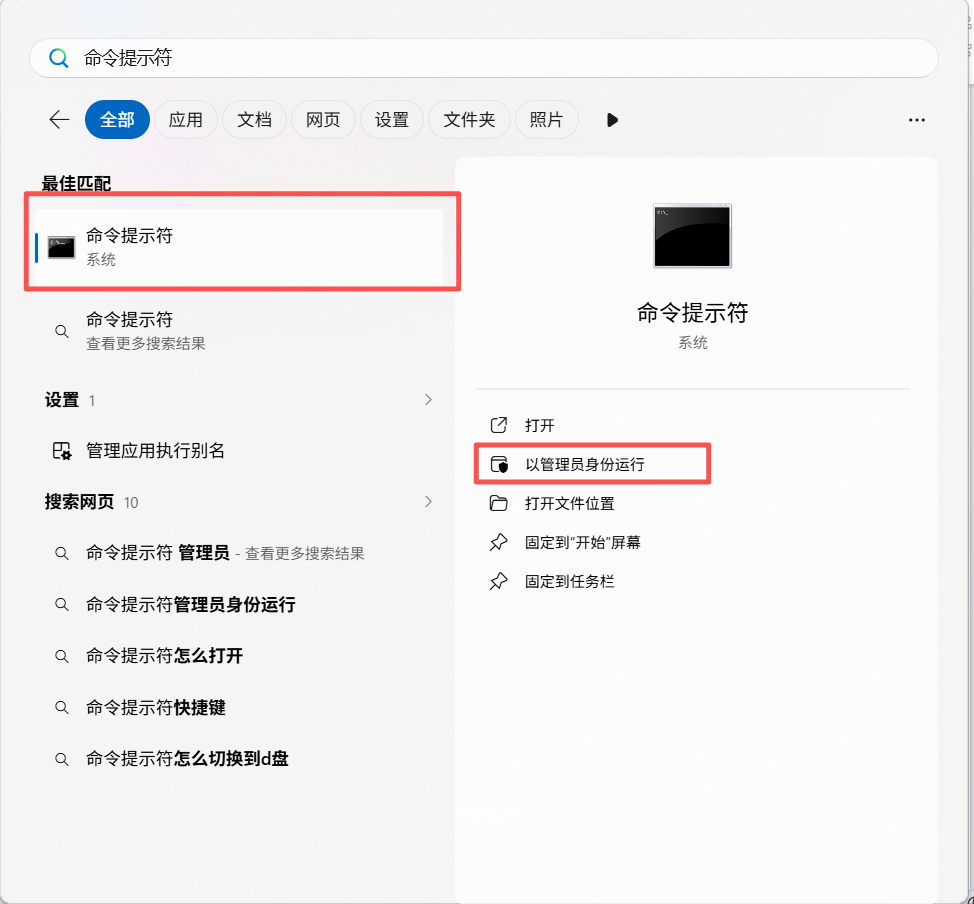 第一步:到系统的开始菜单,搜索CMD右键以管理员身份运行,或者选择管理员身份运行。