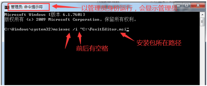 那么在小黑窗内,输入msiexec /i “C:\Users\Administrator\Desktop\福昕高级编辑器专业版.msi" 进行回车。