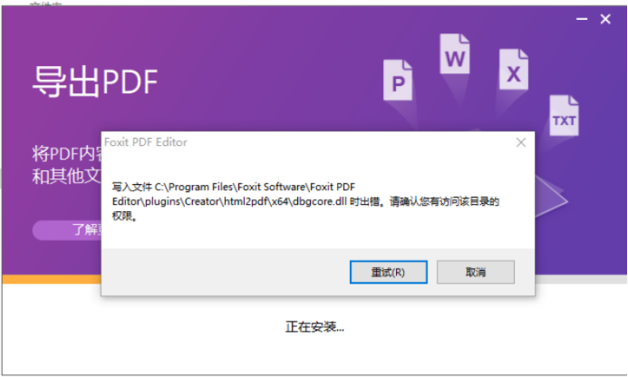 安装过程中出现“写入文件“x盘Foxit PDF Editorpluginsxxx”时出错。请确认您有访问该目录的权限”这个提示的原因是:安装权限不足或者是被安全软件阻止了。