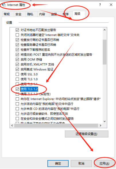 2).点标签栏--高级,勾选“使用TLS1.2”点击“应用--确定”,即可解决啦!