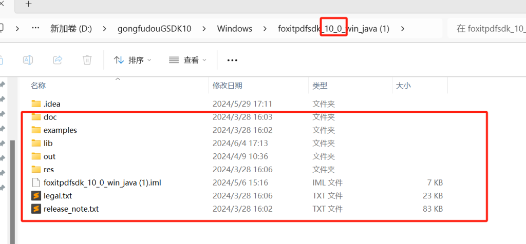 1. 下载 Windows Java 包,解压到一个新的目录如 "foxitpdfsdk_10_0_win_java",如图所示。