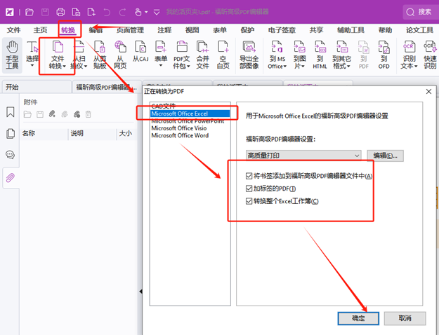 在Excel中选择福昕PDF”插件—创建PDF--选择需要转换的工作表进行添加转换