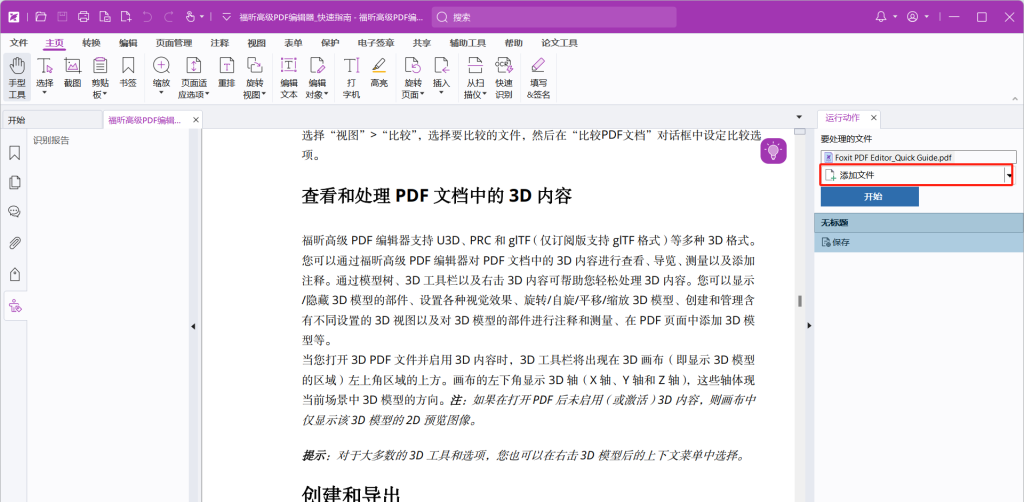 5、执行PDF批量转图片的动作后,软件右侧会出现【运行动作】选项卡,此时我们可以点击右侧菜单上的下拉菜单可以进行添加文件或添加文件夹操作,将文件添加完成后点击下方的开始选项可以自动执行PDF文件转图片格式的操作