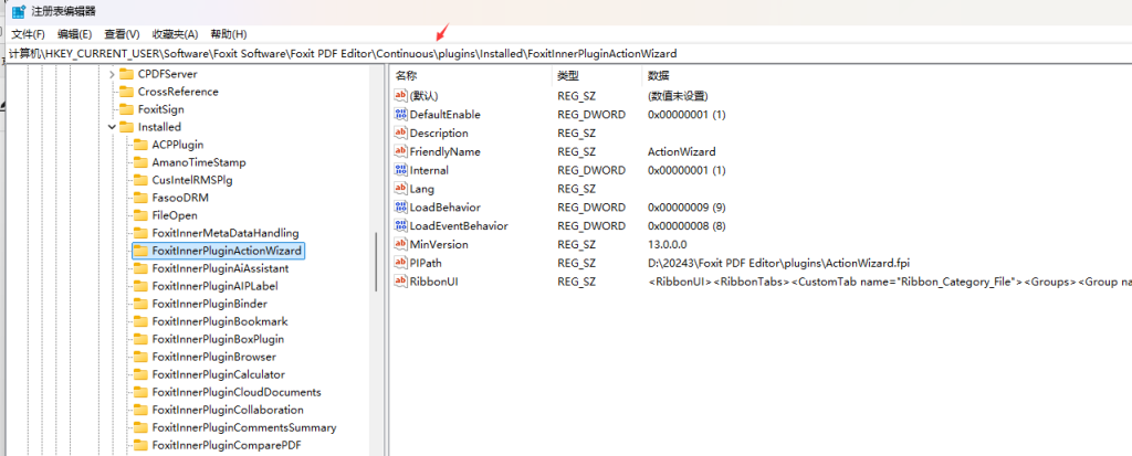 编辑器所有的插件,都在目录下:计算机\HKEY_CURRENT_USER\Software\Foxit Software\Foxit PDF Editor\Continuous\plugins\Installed