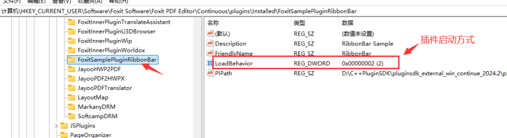 a. 如果需要卸载插件,直接删除左侧注册表目录中“FoxitSamplePluginRibbonBar”,重启编辑器即可。