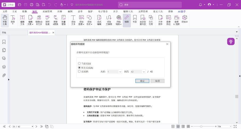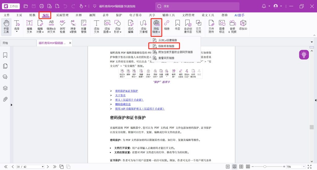 我们利用福昕高级PDF编辑器打开一份带有超链接的PDF文档,点击“编辑”→“网络链接”→“移除所有链接”。