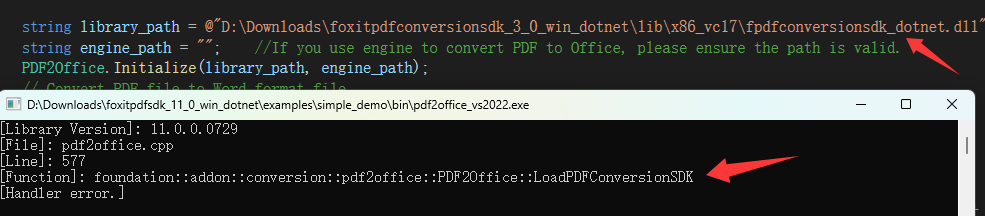 当您在使用福昕PDF SDK 的 PDF 和 Office 互转功能时,如果自行从官网下载了福昕PDF Conversion SDK 开发包,并在 PDFOffice.Initialize() 方法中设置了 DLL 路径,但在此步骤发生报错,可以从以下几个方面进行排查: