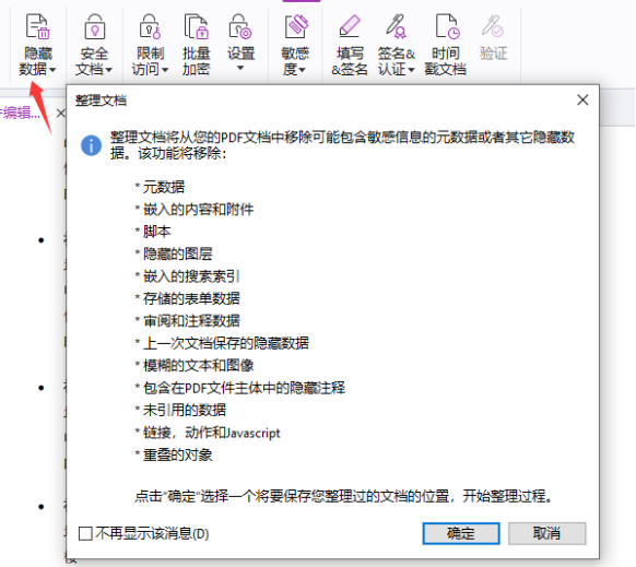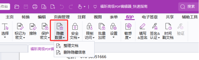福昕高级PDF编辑器支持删除PDF文档中相关隐藏数据,点击“保护-隐藏数据”选项,提供“整理文档”和“删除隐藏信息”两项功能。