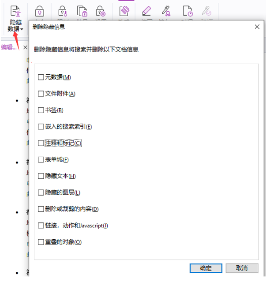 (2)“删除隐藏信息”:适合自定义删除文档中某些一个或者多个数据,比如文件附件、书签、注释等。可以勾选需要删除的对象,点“确定”。