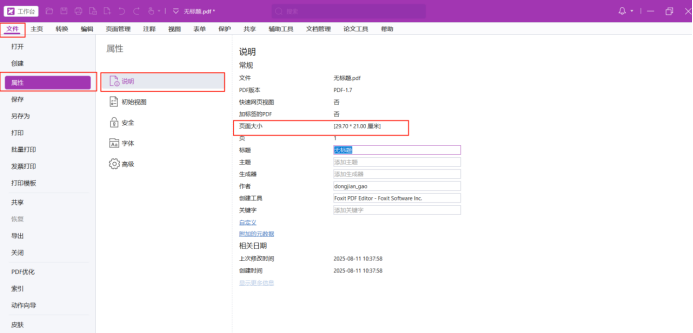 出现这个情况的时候我们需要检查一下页面是否存在页面旋转,标注的旋转角度以当前页面旋转角度为准,所以如果两个页面旋转角度不一样,粘贴后标注的方向会有变化。我们可以通过文件菜单-属性-说明中看到页面大小的参数