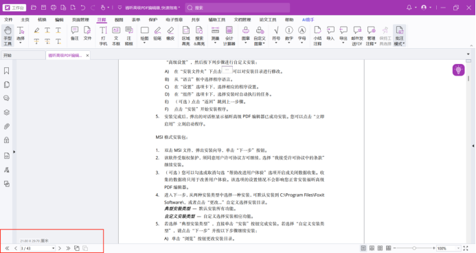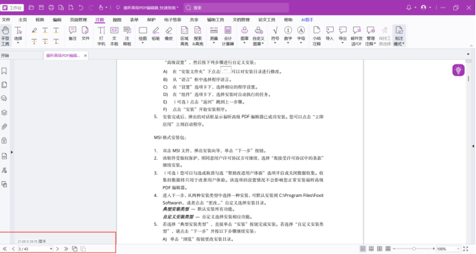 首先我们启动福昕高级PDF编辑器打开需要编辑的文档,当我们想要查看图纸尺寸的时候可以将鼠标移动到软件左下角的位置悬停一会儿就可以看到具体的文档尺寸信息了。但是如果将鼠标移动到其他的位置后图纸尺寸会自动消失