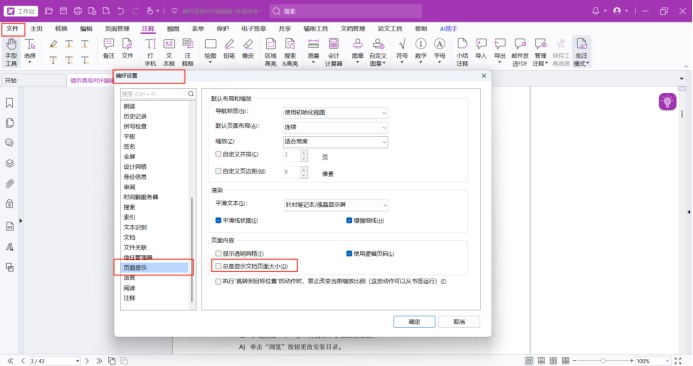 如果想实现图纸尺寸的常显示,可以在福昕高级PDF编辑器中点击文件-偏好设置-页面显示-页面内容-总是显示文档页面大小。