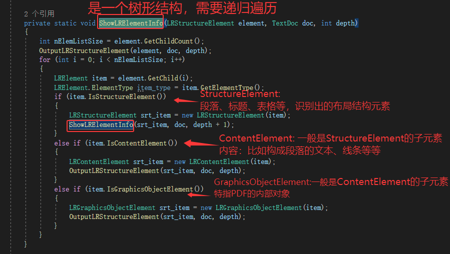 Demo中的ShowLRElemntInfo函数演示了识别完成后如何获取识别结果:需要遍历每个节点。需要注意的是,不同类型的节点代表不同含义,通常情况下只需关注StructureElement类型即可。