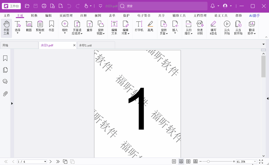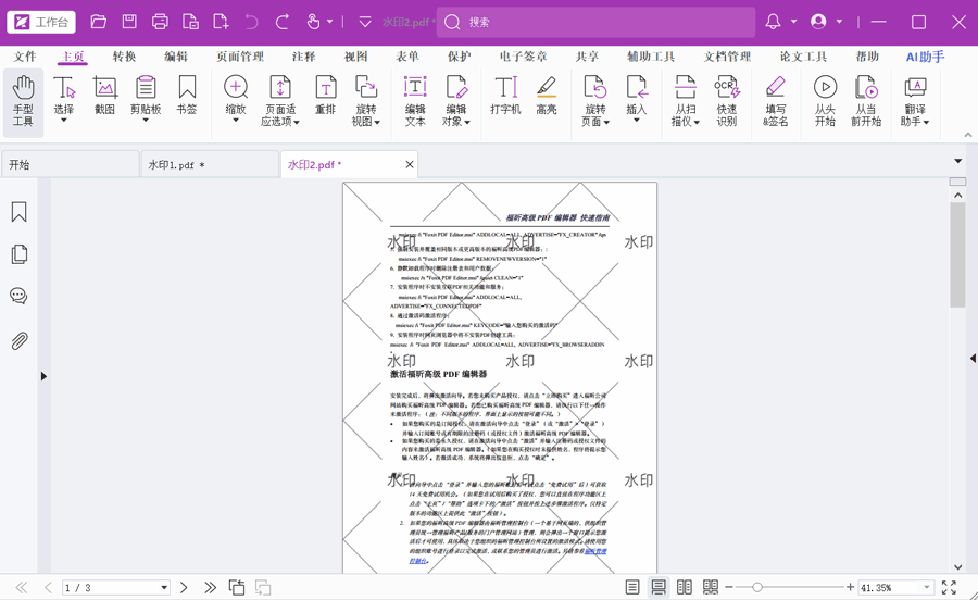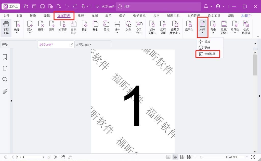我们利用福昕高级PDF编辑器,打开一份需要去除水印的文档,点击“页面管理”→“水印”→“全部移除”即可。