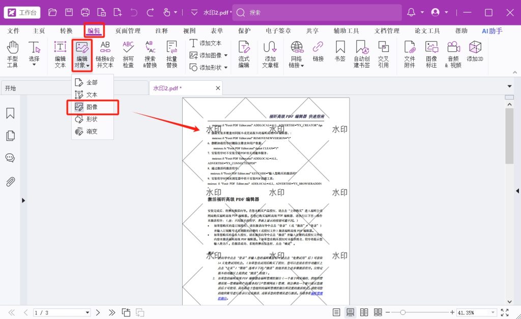 还可以点击“编辑”→“编辑对象”→“图像”,然后点选住水印,按住键盘delete删除即可。