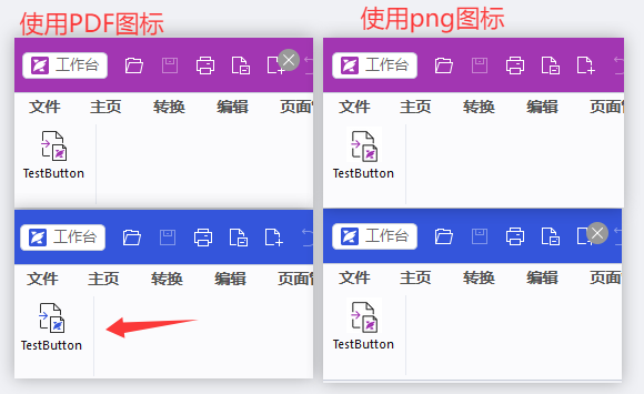 使用.pdf格式作为图标的一个优势,是可以在更改编辑器主题色时,图标颜色可以跟随变化,而位图格式的图标做不到这个效果,差异如下图所示: