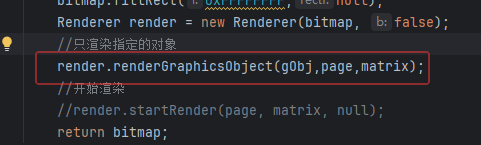 如果在对PDF进行截图,或局部渲染时,只希望显示某几个图形、文本、图片对象,而不显示其他内容。可以通过Renderer的renderGraphics0bject()来指定要渲染的对象, 并且不使用渲染整个页面的Render.startRender()接口。如下图所示:
