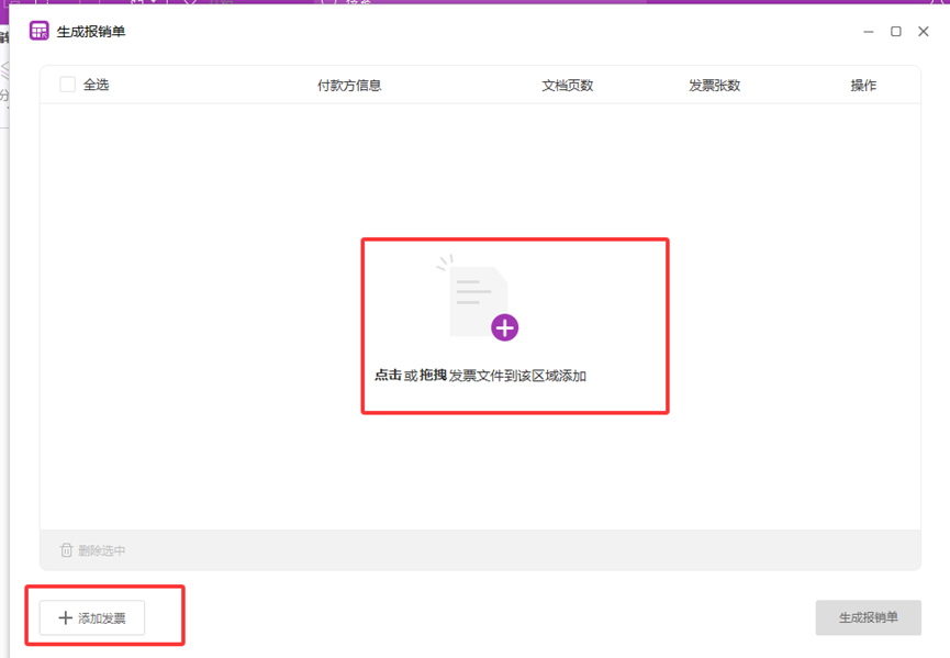 打开软件,点击“文档管理-生成报销单”选项,在弹出的“生成报销单”方框中可通过单击或者拖拽的方式将所需要的发票添加进去。