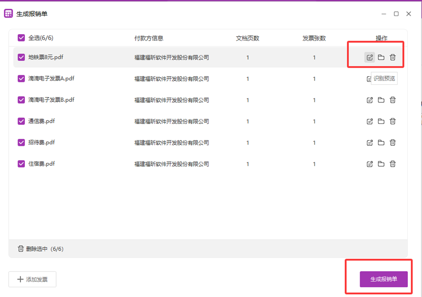 添加之后可以在“操作”选项下选择识别预览、打开文件位置以及删除等选项,确定没问题之后点右下方的“生成报销单”选项。