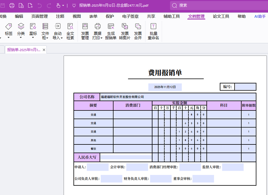 福昕高级PDF编辑器专业版+支持将需要报销的发票批量生成报销单,方便后续提交内部OA系统进行审核,具体操作如下: