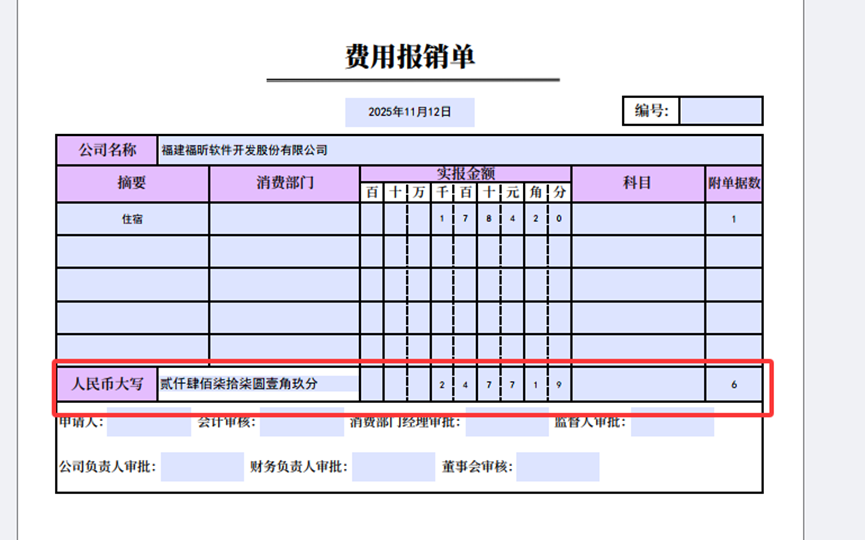 由于添加的发票有6张,故生成的费用报销单是为两页,此报销单是以表单形式呈现,可以编辑里面的数字和文字内容。