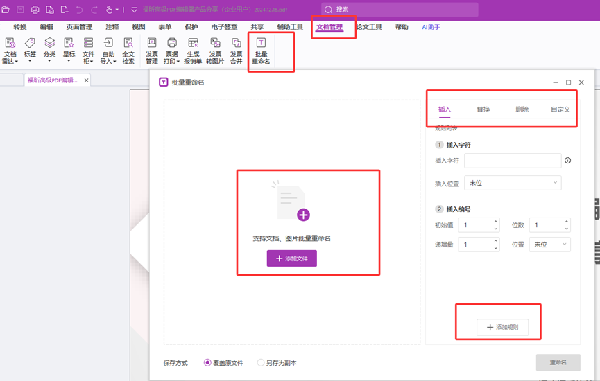 打开编辑器,点击“文档管理”菜单,点击“批量重命名”选项,提供插入、替换、删除、自定义等多种方式,可以按预先设置好替换规则来批量修改文档名称。并提供覆盖原文件、另存为副本的功能。