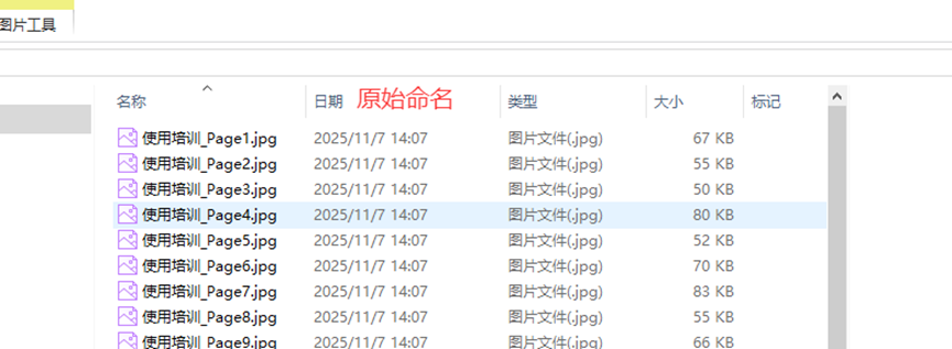 一份pdf文档转图片时候生成图片格式名称是:文件名称_page1,如图所示为:“使用培训_page1”、“使用培训_page2”等等。