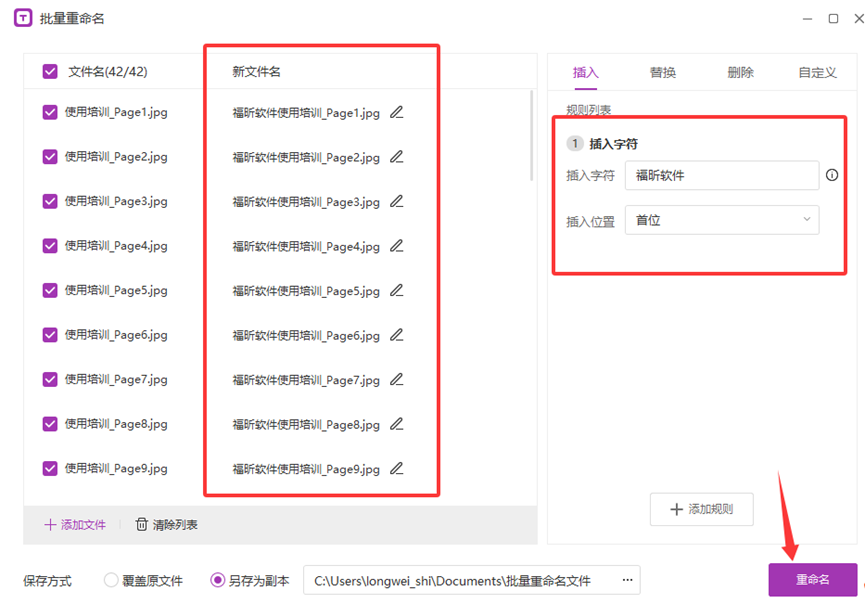 如果要修改为“福昕软件使用培训_page1”,可以点“添加文件”把所有图片格式添加之后,选择“插入”,输入插入字符为:福昕软件,选择插入位置为首位,删除插入编辑选项,左侧可以预览实际效果,然后选择“另存为副本”点重命名即可。