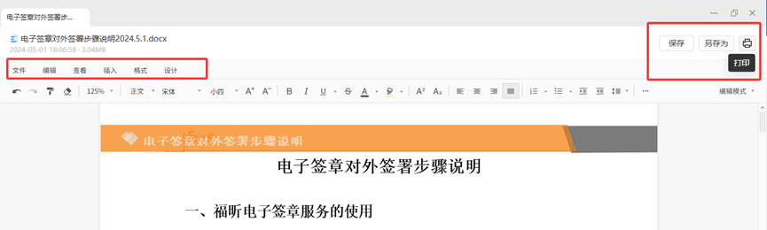 点击“编辑”选项,选择“在线编辑文件”即可进入编辑模式,软件提供常见的操作功能,如编辑、查看、插入、格式、设计,打印等功能,操作完成之后可以直接在线保存,或者另存到本地当中。