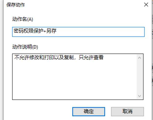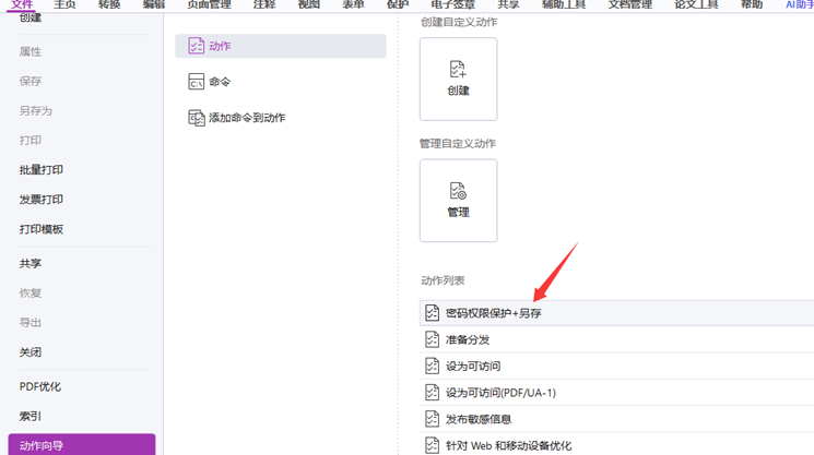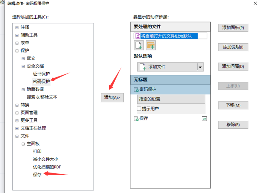 点击“文件-动作向导”选项,在选择添加的工具中分别添加安全文档中的“密码保护”以及主面板的“保存”选项。