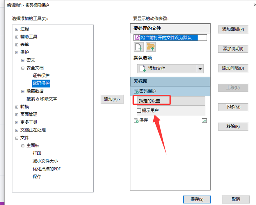 添加之后,把“提示用户选项”取消勾选,并点击“指定设置”,预先设置需要添加密码保护的方式,软件提供打开文档需要密码,以及文档权限设置密码两种,可以自定义选择。