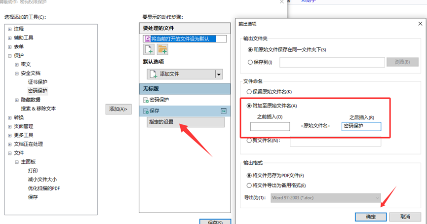 接着返回设置窗口点击保存-指定位置,可以设置输出文件夹、以及文件命名选项,如选择在原文件名称添加“密码保护”字样,设置完成之后点确定。