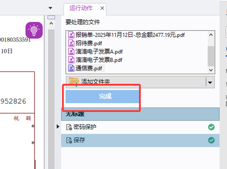 最后在动作向导面板下方的动作列表中找到刚刚创建的动作,点进去添加所需要批量操作的文档,点“开始”软件执行密码保护和保存两个动作直至完成。
