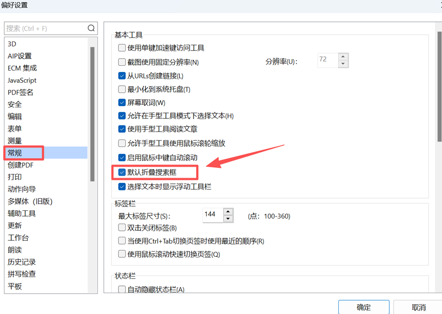 除此以外,用户也可以选择勾选“文件”-“偏好设置”-“常规”-“默认折叠搜索框”选项,选择后,搜索框将折叠为一个放大镜图标,以此方便显示完整的文件名。