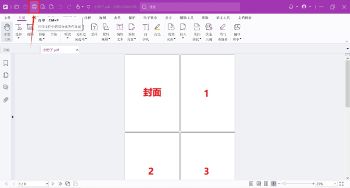 1、我们使用福昕高级PDF编辑器,打开一份需要打印成小册子的PDF文档,点击左上角“打印”按钮。