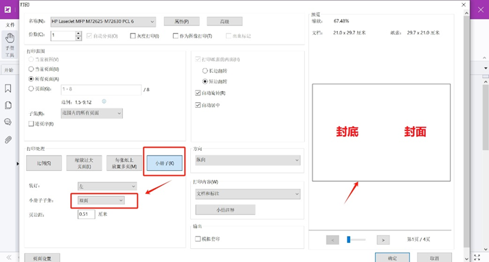 2、选择好打印机,该打印机必须支持双面打印。在“打印处理”选项中,选择“小册子”,小册子子集选择“双面”,即可在右侧看到打印预览图。