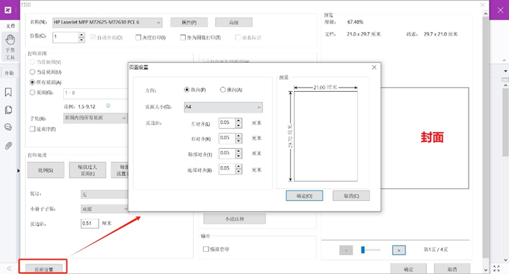 此外,在打印前可以点击左下角“页面设置”,可以对方向、页面大小、页边距进行调整。