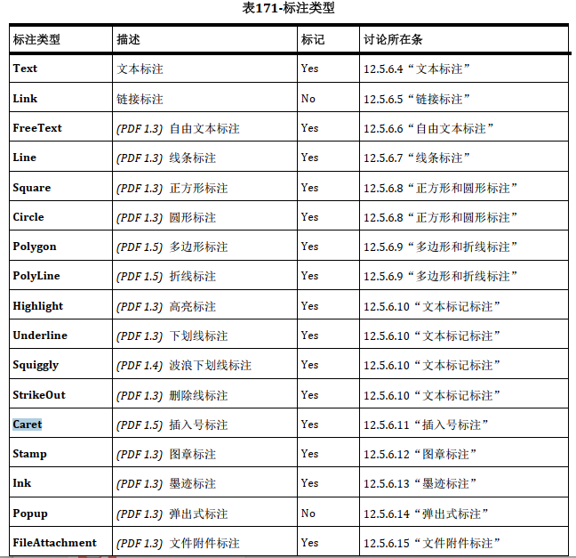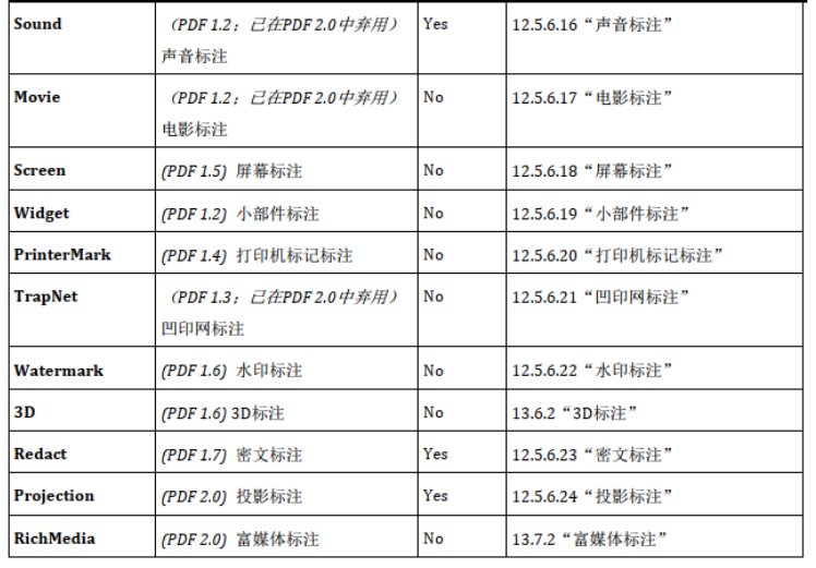 Annot不仅可以在文档上做标记,还可以嵌入附件、播放音视频等等,例如widget是小部件注释,通常表单域中会经常使用到、Link是超链接、poppup是弹窗注释(具有标记属性的Annot都会附带popup子注释)。下方PDF标准文档中,对每种类型Annot的描述: