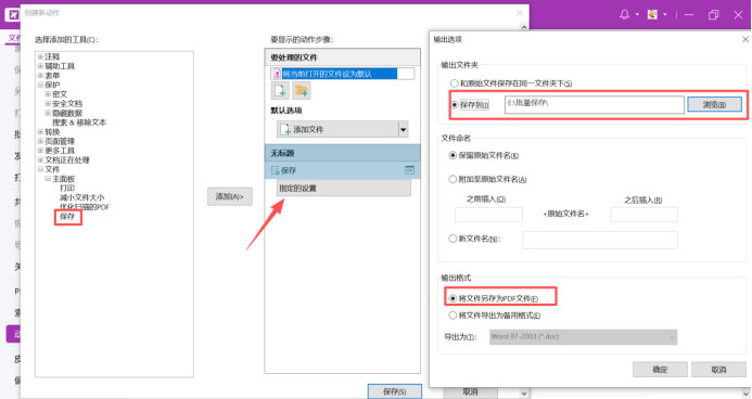 第一步,添加保存操作,选择制定的设置,选择输出的文件夹、选择输出的格式为PDF