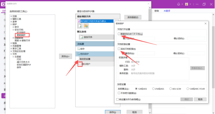 在添加保护文档的操作,在制定的设置中添加密码或权限管控,取消勾选提示用户的操作