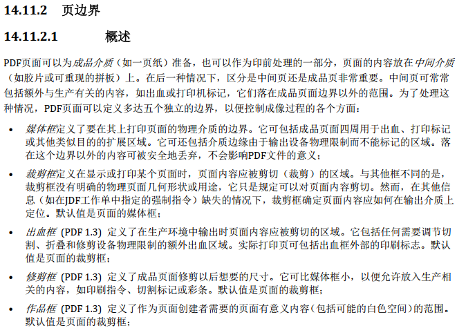 | MediaBox(介质框) | PDF 页面的物理最大边界,定义页面的原始尺寸(如 A4、Letter),是所有其他框的基准 | 1. 决定 PDF 的底层画布大小2. 包含出血、裁切标记等所有内容 | 基础基准,所有框均不能超出其范围 |