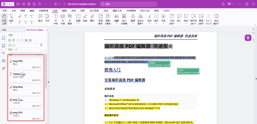 将需要的这是直接进行导入后,在PDF文件中可以看到不同人员对于同一个文件不同的批注建议。此时在福昕高级PDF编辑器中点击左侧的查看文档注释选项,就可以看到添加注释的作者、注释类型等相关信息了