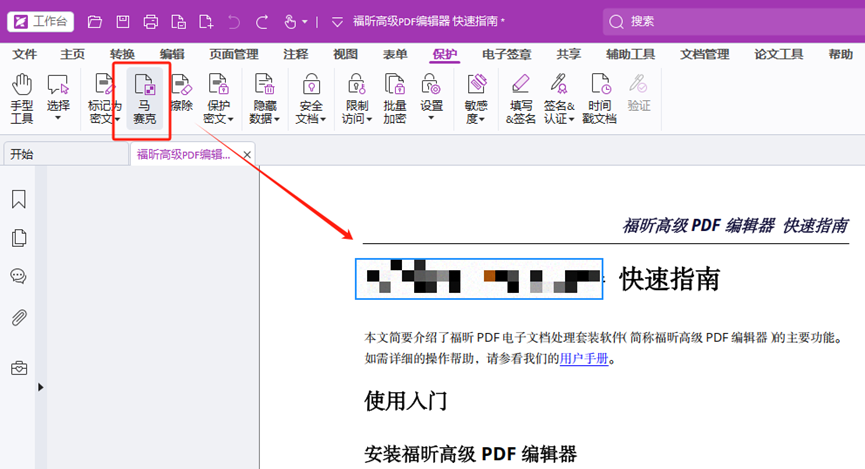A:在福昕高级PDF编辑器保护菜单项下,选择“马赛克”,在需要打码的文字内容上画框确定即可