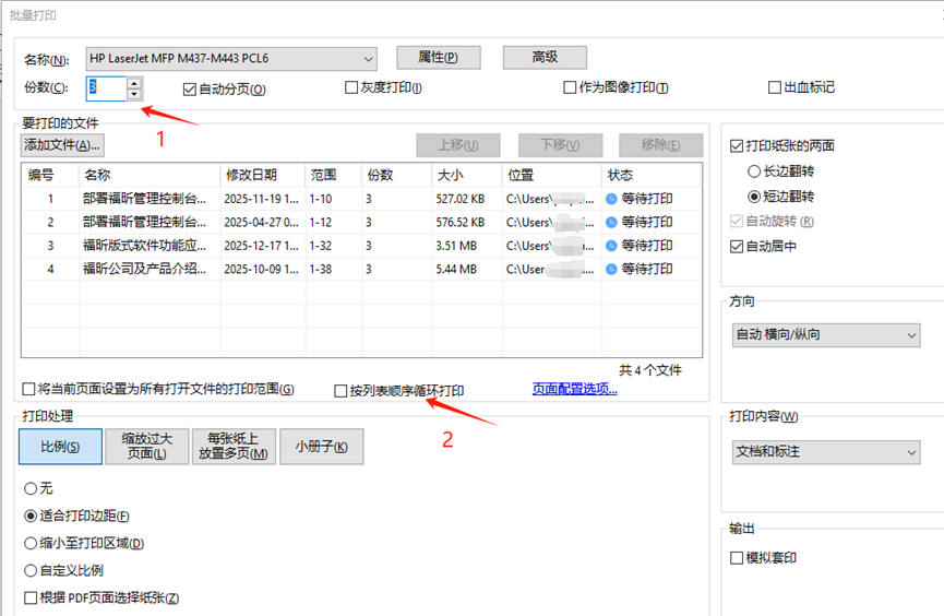 在弹出的批量打印弹窗中,将需要批量打印的文件添加进来,先设置好需要打印的文档分数,然后勾选“按列表顺序循环打印”即可。