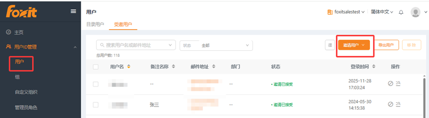 进入福昕管理控制平台界面,点左侧面板“用户ID管理-用户”然后在左上方点“邀请用户”可以在添加用户邮箱的同时给用户分配标准版/专业版的授权。