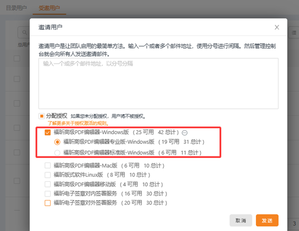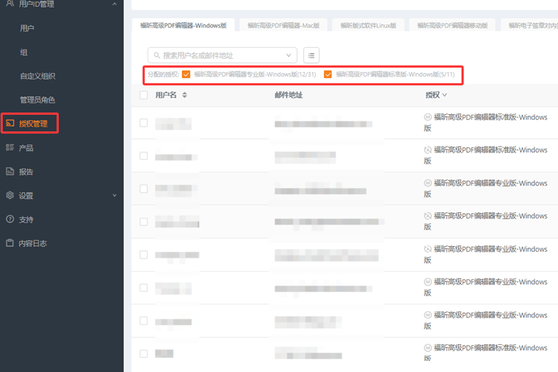 如果企业当同时采购编辑器标准版和专业版两个版本可以在福昕管理控制平台上分配和查看授权。