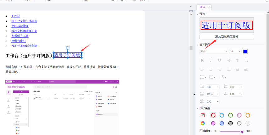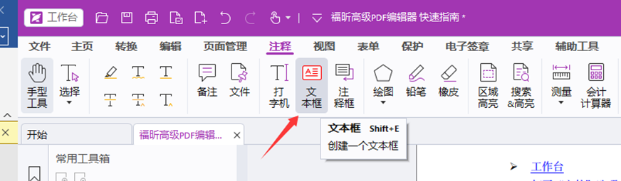 打开编辑器软件,点击注释菜单,选择一个要操作的注释功能,比如文本框,打开右侧编辑面板编辑好文本框内容之后,点击面板中“添加到常用工具箱”。