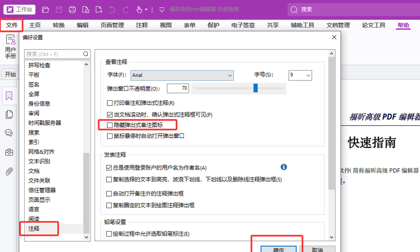 打开编辑器文件,点击“文件-偏好设置-注释”取消勾选“隐藏弹出式备注方框”然后点确定。